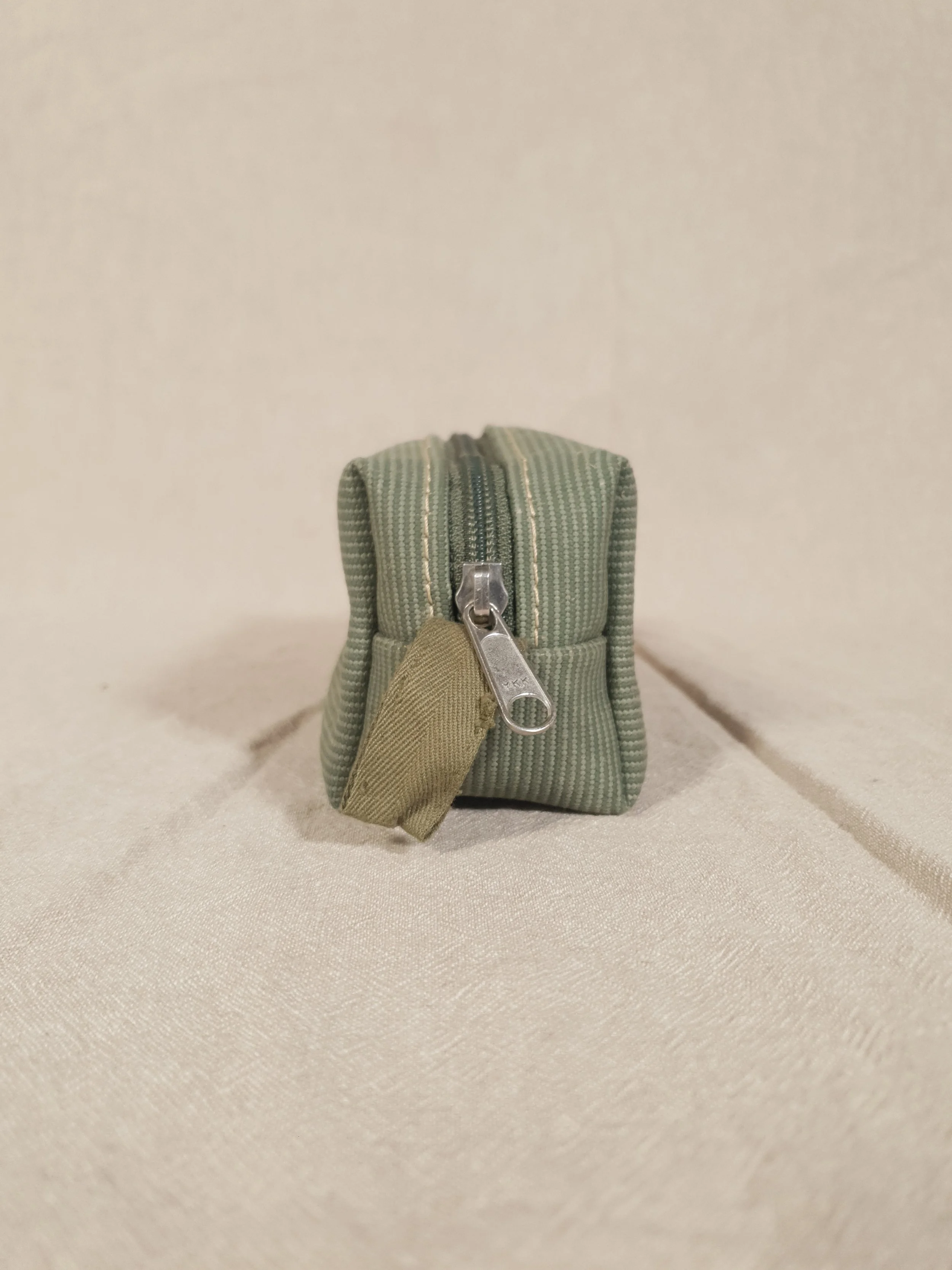 Da das Etui zu einem grossen Teil aus recycelten Materialien besteht sind Spuren des „Vorlebens“ nicht auszuschliessen; unseres Erachtens sind sie sogar gewünscht: Teilweise weist der Stoff kleine Löcher von früheren Nähten auf, in seltenen Fällen ist er etwas fleckig, geflickt. All dies beeinträchtigt jedoch in keiner Weise die Funktion.