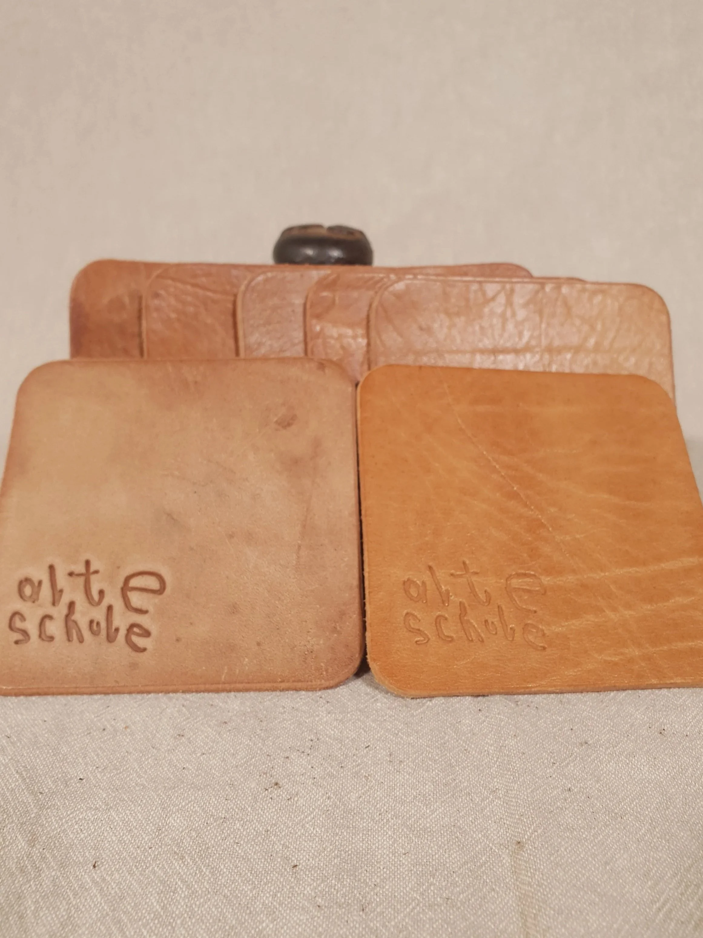 Die Untersetzer wurden mit natürlichem Lederpflegemittel behandelt. Produkte aus natürlich belassenem Rindleder erhalten mit der Verwendung eine Patina. Je nach Wasserkontakt, Hautfett von den Händen und Sonneneinstrahlung werden sie mit der Zeit dunkler. Ringe, bspw. von Wasser, Rotwein oder Kaffee sind bei hellem Leder nicht zu vermeiden, erzählen aber Geschichten von gemütlichem Beisammensein und guten Gesprächen bei einem Glas oder zwei...