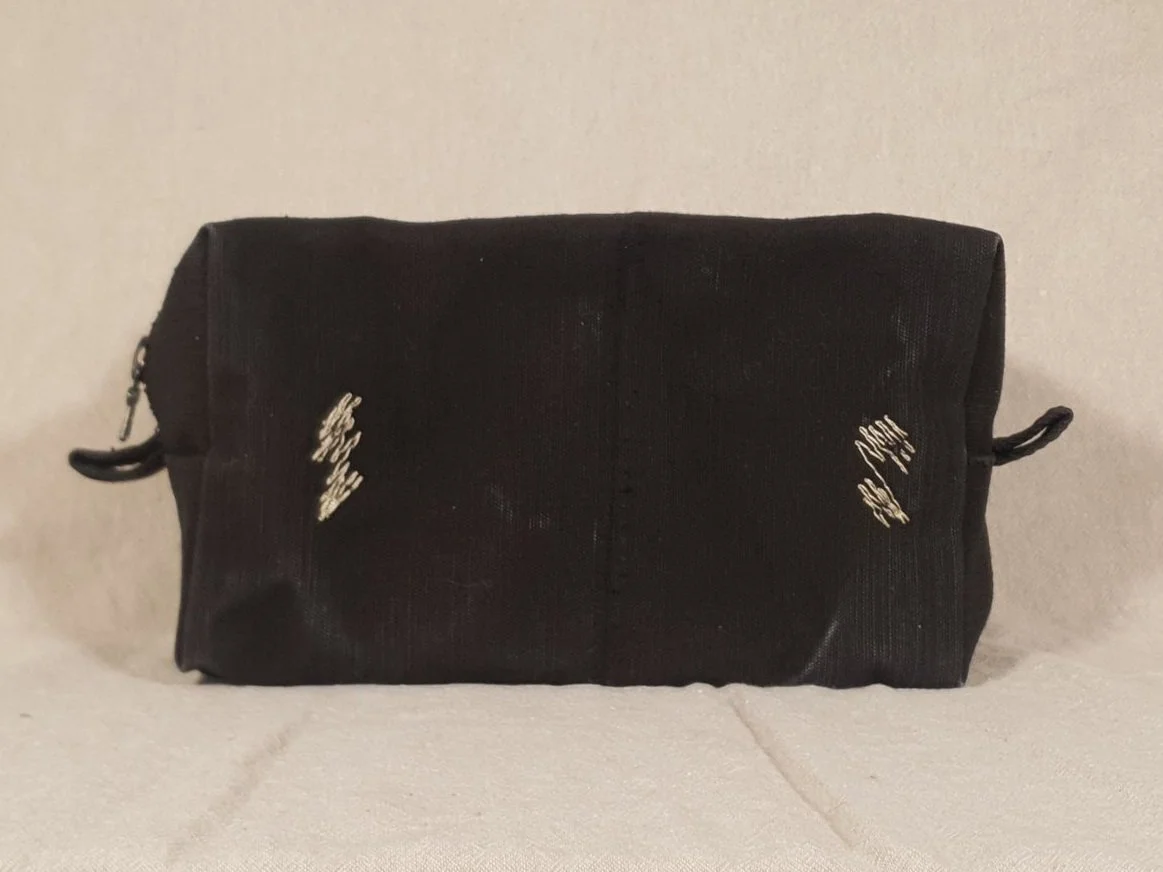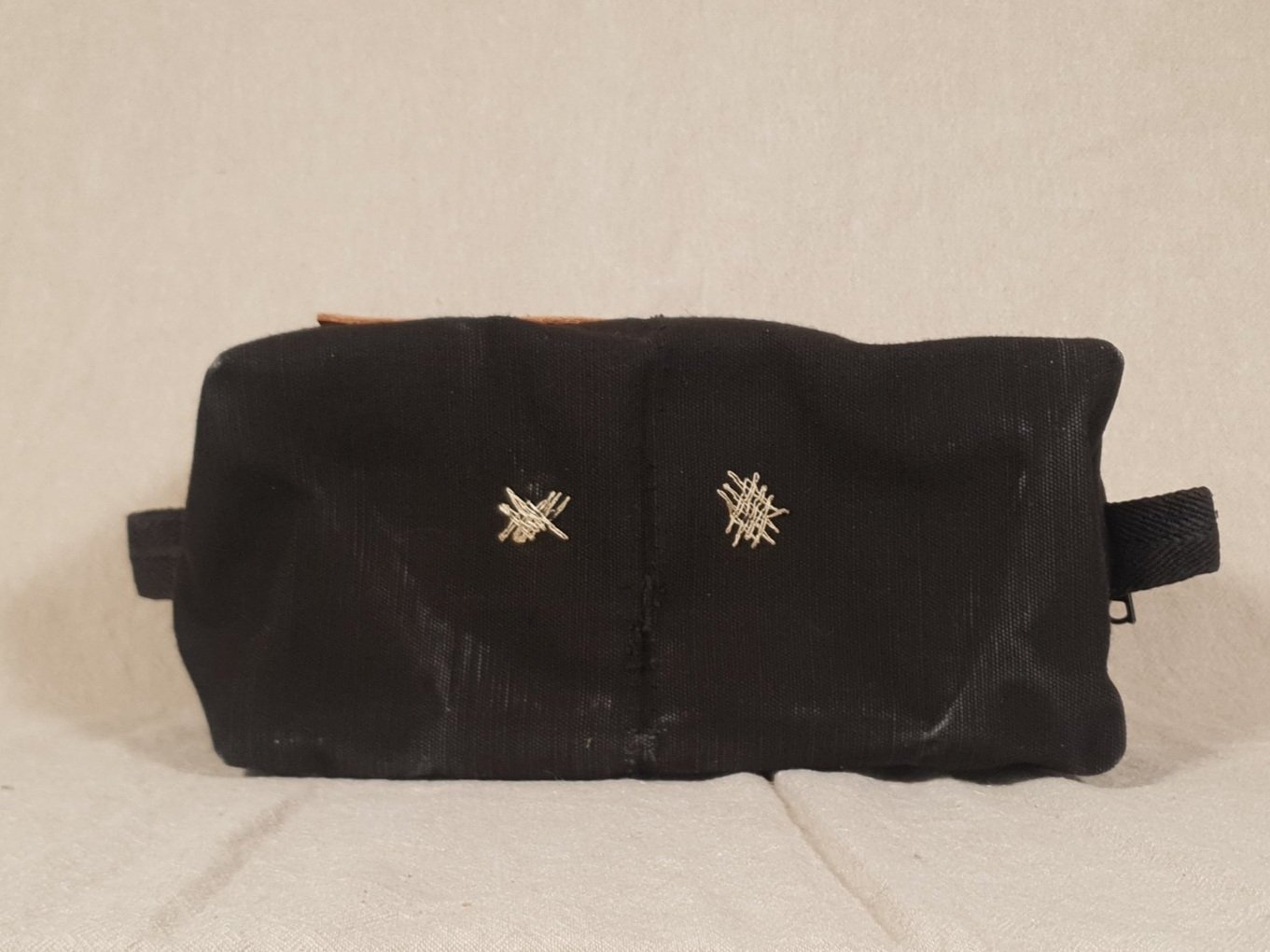 Da das Etui zu einem grossen Teil aus recycelten Materialien besteht sind Spuren des „Vorlebens“ nicht auszuschliessen; unseres Erachtens sind sie sogar gewünscht: Teilweise weist der Stoff kleine Löcher von früheren Nähten auf, in seltenen Fällen ist er etwas fleckig, geflickt. All dies beeinträchtigt jedoch in keiner Weise die Funktion.